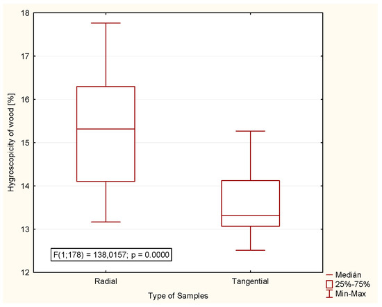 Impact type of sample on the values of wood hygroscopicity (p < 0.0000).
