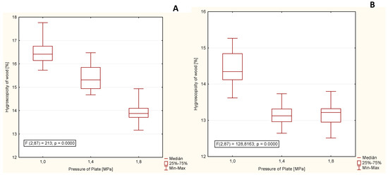 Effect of plate pressure on the resulting value of wood hygroscopicity for the (A) radial and (B) tangential samples.
