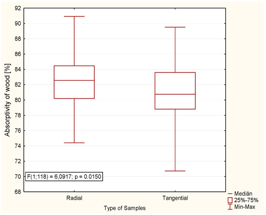 The change in the absorptivity of wood was not significantly affected by the pressure of the heating plates. The effect of the radial and tangential samples was statistically significant at the level of significance p < 0.05 (Figure 13).