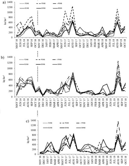 Monthly changes in the amounts of litterfall collected (kg ha−1) in (a) unburned plots in the mixed stand (P2NB, P5NB, and P9NB) and the pure stand (B1NB, B3NB, and B9NB); (b) plots burned in spring in the mixed stand (P3SB, P4SB, and P6SB) and the pure stand (B2SB, B5SB, and B6SB); and (c) plots burned in autumn in the mixed stand (P1AB, P7AB, and P8AB) and the pure stand (B4AB, B7AB, and B8AB).
