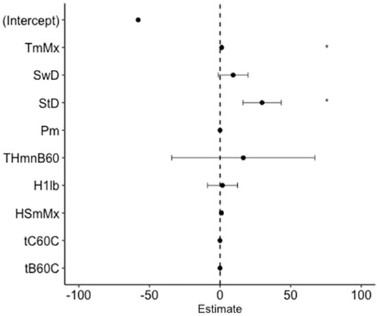 Estimation of fixed effects. TmMx, mean maximum temperature; SwD, days with snow; StD, days with storm; Pm, monthly precipitation; THMnB60, minimum bark thickness at 60 cm from the base; H1lb, height at which first live branch appears; HSmMx, mean maximum scorch height; tC60C, time where temperature is higher than 60 °C in cambium; tB60C, time where temperature is higher than 60 °C in bark. (*) Indicates significant effects.