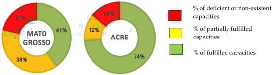 Mato Grosso presented a greater proportion without the capacity to implement an adequate benefit-sharing system, while 38% of the capacities were partially fulfilled, and 21% were deficient or non-existent. On the other hand, Acre showed better performance: most of its main capacities had already been implemented and are currently in operation (74%), which indicates the maturity achieved over more than a decade of work towards a policy leading to REDD+. Otherwise, 12% of its capacities remained only partially fulfilled, and 14% were non-existent.