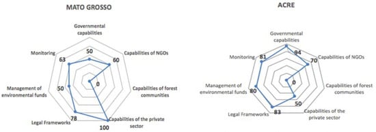 The final scores were obtained from arithmetic averages, the contributions of experts, and the technical considerations of the team responsible for the evaluation. Finally, a subnational performance score was calculated in each thematic block, and a general score of all blocks was achieved. Figure 1 shows a graphical representation of the three different levels of performance achieved by the states of Mato Grosso and Acre. Scores of the capacities discriminated by key components in each thematic building block are provided in Appendix A.