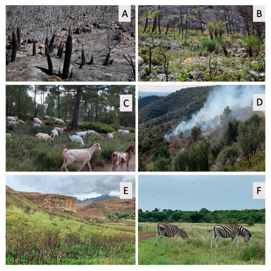 Fire and grazing shapes the landscape of the world. (A), Recently burnt (2 days) Mediterranean macchia in Carcaixent (València province, Eastern Iberian Peninsula) June 2016. (B), Vegetation recovery after the fire of Cala de la Granadella (Alacant province, Eastern Iberian Peninsula) April 2017 (wildfire August 2016). (C), The use of goats to reduce fuel at the Bicorp (Massís del Caroig, inland Valencia Province, Eastern Iberian Peninsula). (D), Prescribed fire in Olesa de Montserrat, Catalonia, Janauary 2017. (E), View of the recently burnt area by shepherds at the Golden Gate Highlands National Park, Free State, South Africa (December 2019). (F), Natural grazing act as a vegetation biomass control. Zebras grazing in Hluhluwe Infolosi Park, KwaZulu Natal South Africa (December 2019). Photographs by Artemi Cerdà.