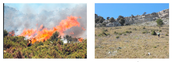 Fire is a global phenomenon and a key ecological factor in the Earth’s dynamics, especially in fire-prone ecosystems [1,2] such as that of the Mediterranean basin, where climate, flammable vegetation, and rugged terrain exacerbate the role of fire [3]. The Mediterranean has been exposed to the effects of fire during the Quaternary Period, modifying its landscapes and endowing many species with adaptive mechanisms that allow them to persist and regenerate after recurrent fires [4]. Thus, the Mediterranean ecosystems evolved with fire. Seen in this light, Mediterranean fires should not be considered as disasters, but rather as natural processes. However, today, forest fires (or wildfires) represent a major concern for many Mediterranean countries owing to the socio-economic changes such as the industrialization and rural population exodus in recent decades [3,4]. These changes account for the current landscape pattern in which forests have replaced ancient agricultural fields, thereby increasing plant cover and the continuity of vegetation and, as a result, changing the fire regime and increasing wildfire risk [5]. Landscape changes are also attributable to fire suppression policies. They were introduced in response to the increase in wildfire activity since 1960 and based on the extinguishing of fires to reduce their spread. Prescribed fires were not allowed until recently. The objective was to remove fires from the forest, although forest fires are part of the natural Mediterranean ecosystems. These actions have facilitated the accumulation of fuel in Mediterranean forests, making them veritable tinderboxes waiting to burn [6,7]. Furthermore, fire affects the fate of soil infiltration, soil erosion processes and rates, vegetation changes, soil properties, and ecosystem services [8,9,10,11,12].