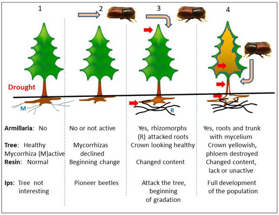 This review addresses the hypothesis that “Nature” itself (the term Nature in the authors’ interpretation is the entirety of species, natural phenomena and the mechanisms and dependencies connecting them, both internal, at all functional levels, and external creating reality in time and space that is either perceived or not by humans) causes changes in species composition, an example being spruce stands growing in unsuitable habitats (e.g., in monocultures or stands on post-agricultural lands), and/or under conditions of water stress (e.g., long-term drought and disappearance of mycorrhiza from the soil). In the presence of Armillaria in coniferous forests, roots of trees weakened by drought undergo infection by fungal rhizomorphs. Infection triggers a chemical signal arising from increased resin production in attacked roots, and the formation of metabolites from decomposition [19]. These chemical signals are received by bark beetle pioneers, maybe indicating that “there is food, there are breeding bases, it is time for reproduction”. However, the beetles are actually being deceived; such signals indicate to beetles that fungus has affected the entire tree (including mycorrhiza and extrametrical mycelium) and that the tree is dying. In coniferous forests, in the case of the initial phase of Armillaria infection, roots are gradually infected, and the false chemical signal deceives bark beetles into attacking the tree. This chemical signaling can also work backward in some instances, with some chemicals triggered by bark beetles reducing fungal growth [20,21,22], although such a mechanism is not recognized in the case of I. typographus. The developing insect outbreak terminates when live trees, the beetles’ food resource, have been killed, and natural enemies that reduce the population of the beetle appear. In the end, tree death caused by Ips benefits Armillaria, providing dead trees that are the substrate for the fungus for years.