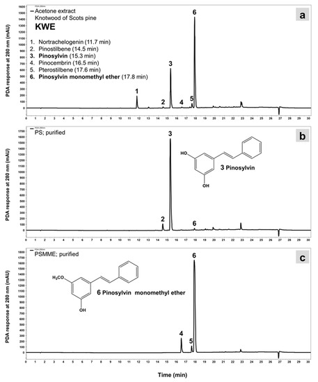 - Poljanšek, I.; Oven, P.; Vek, V.; Raitanen, J.E.; Hemming, J.; Willför, S. Isolation of pure pinosylvins from industrial knotwood residue with non-chlorinated solvents. Holzforschung 2019, 73, 475–484. [Google Scholar] [CrossRef]