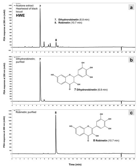 - Vek, V.; Poljanšek, I.; Oven, P. Efficiency of three conventional methods for extraction of dihydrorobinetin and robinetin from wood of black locust. Eur. J. Wood Wood Prod. 2019, 77, 891–901. [Google Scholar] [CrossRef]