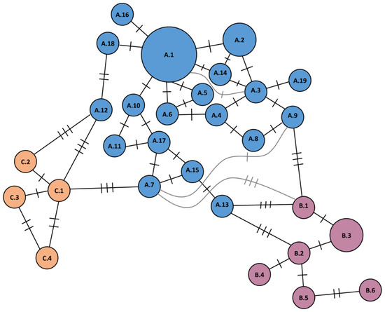 The 29 defined haplotypes (Figure 1) are assumed to be closely related within their assigned major clusters or haplogroups: A (blue), B (purple), and C (orange). Most of them are related to another haplotype differing at only one marker. Nevertheless, haplotypes A.12, B.6, and C.4 each differed from other haplotypes within their clusters by two mutations instead of one. Therefore, it is not certain whether they belong to their haplogroups.