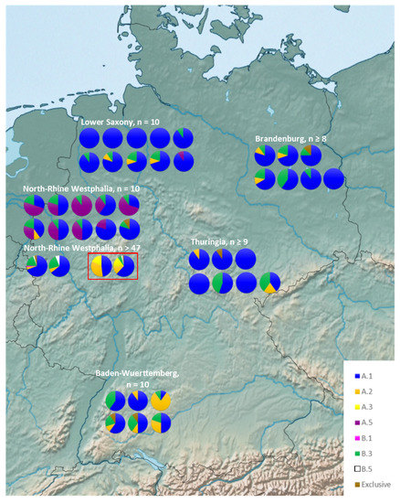 Haplotype A.5 is widespread in North Rhine-Westphalia (64% of NRW stands) and present once in Lower Saxony (Germany). Thus, overall, it is present in 23% of German stands (Figure 2). Nevertheless, it could only be found in a single individual in the Nine Mile Woods population from Nova Scotia in North America (Figure 3). One of the rare haplotypes, B.5, was also observed in the same Nine Miles Woods population from Nova Scotia (Table 1) and in three of the German stands in North Rhine-Westphalia (Figure 2 and Figure 3). Haplotype A.3 was detected in the Appalachian Mountains and the Great Lakes region around Michigan but does not occur in northeastern populations of New Brunswick, Prince Edward Island, and Nova Scotia (Figure 3). In Germany, A.3 was only observed in two stands Diergardt 1 and 2 (“Bornheimer Roteiche”), with documented origin from Virginia, USA.