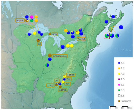 Figure 3. Distribution of Q. rubra chloroplast haplotypes in North America. The native red oak range is highlighted in green. “Exclusive” are haplotypes that were found only in North America, but not in Germany. For better visualization, they were highlighted by brown color and pooled together in pie charts, but their individual names are listed within the brown frames placed next to the respective population. A5 and B.5 were represented by a single tree each in one population of Nova Scotia highlighted by the red frame.