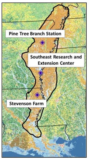 The LMAV region of the southern US has a high potential of cellulosic biomass production, since it has a long growing season and well developed agricultural industry [33]. The region is well equipped to deliver the feedstocks to processing facilities and consumer distribution points because it has significant transportation and pipeline systems [34]. These factors make the LMAV well positioned for bioenergy production. Traditionally, the marginal soils of those areas are used for soybean-grain sorghum production. An agroforest-based bioenergy study, comprised of cottonwood and switchgrass, was initiated by Liechty et al. [35] in 2009 at three locations in the LMAV: