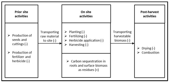 Figure 2 presents the Life Cycle Inventory (LCI) diagram. Activities that resulted in a net carbon addition to the atmosphere were given a negative sign, while those that resulted in removal were given a positive sign. The harvested dry biomass, when combusted raw for energy, emitted carbon into the atmosphere. These emissions were not considered as negative carbon release, because they began as atmospheric carbon and returned to the atmosphere after combustion.