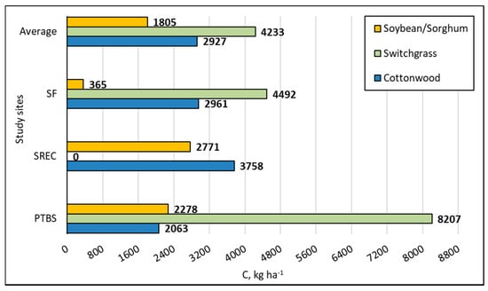Switchgrass sequestered the highest amount of carbon in the above ground shoot system (Figure 3) in three years, averaged across all three sites, even though there was no harvest in site SREC. This is because harvest from switchgrass in PTBS well compensated for the lack of harvest in SREC. Perhaps the silt loam soil in PTBS was better suited for switchgrass production. Aboveground biomass production for cottonwood, switchgrass, and soybean/grain sorghum rotation was 5.9, 9.6, and 3.8 t ha−1 respectively, averaged across sites. For the LCA of carbon, all this biomass was assumed to be harvested and transported to a production facility for conversion to energy. Therefore, no carbon other than that in the root system and surface residue was considered to be sequestered on site. The amount of carbon harvested from switchgrass was about 1.45-times and 2.35-times greater than the amounts of carbon harvested from the cottonwood or the soybean/grain sorghum rotation.