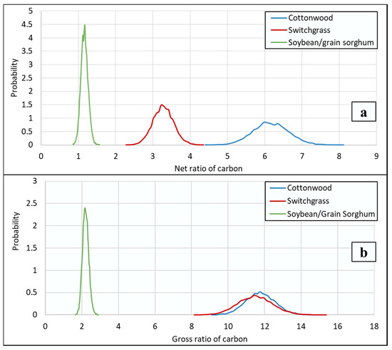 After including carbon sequestered in harvested biomass (Figure 4b), we found that cottonwood and switchgrass overlapped, which suggests that these two bioenergy crops may not be statistically different than each other in terms of gross ratio of carbon balance. However, bioenergy crops did not overlap with soybean/grain sorghum rotation, neither in net nor in gross ratio.