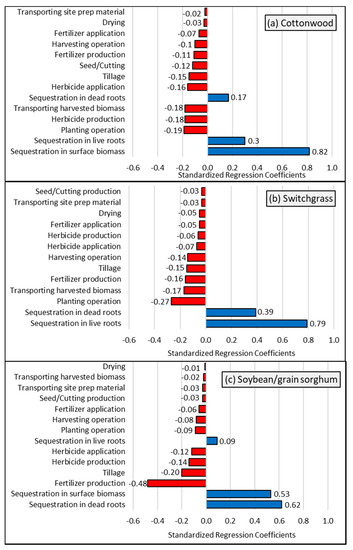 Sequestration in surface biomass was the most influencing factor in net ratio of carbon balance for cottonwood and the second most influencing factor for soybean/grain sorghum ratio, and no surface biomass was considered for switchgrass (Figure 5). Sequestration in live roots played an important role in net ratio of dedicated bioenergy crops as the most significant factor for switchgrass and the second most significant factor for cottonwood. However, it was comparatively less significant for soybean/grain sorghum as the seventh most contributing factor. Sequestration in dead roots were the most contributing factor for switchgrass and the second most contributing factor for soybean/grain sorghum’s net ratio of carbon balance. For emission related factors, fertilizer was the most significant for soybean/grain sorghum rotation, whereas planting operations were the most significant for both bioenergy crops.
