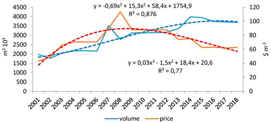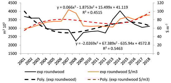 Since 2001, there has been an upward trend in the volume of roundwood imported by European countries, with the imports doubling within the study period (Figure 3). The prices of imported large-diameter beech logs peaked in 2007 at 114 USD/m3, while in the years 2008–2018 they declined to 62 USD/m3.