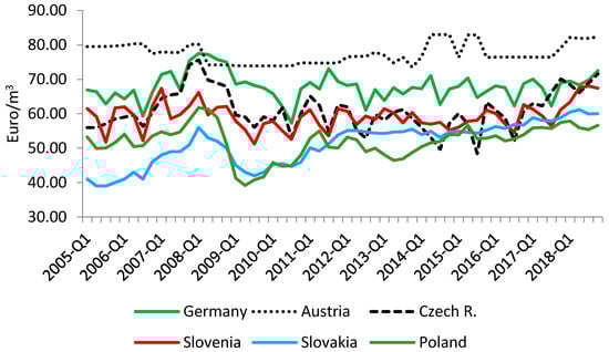 In Germany, the minimum price was almost equal to the maximum price in Poland (57.8 m−3). The largest price variability was found in the Slovak, Polish, and Czech markets, while Austria and Slovenia exhibited the lowest variability. The greatest price increase between two consecutive quarters was recorded in the Czech market (+30.8%), and the greatest decrease in the Polish market (−19.5%).