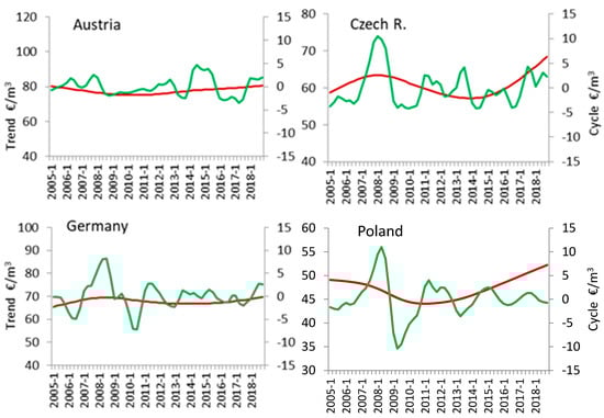 Beech roundwood prices reached the highest values in Austria, which has a highly developed wood industry with a large production potential reflected in the high volumes of imported timber. Austrian demand for timber is associated with the energy sector (3/4 of energy biomass in that country consists of wood products). Overall roundwood prices in Austria grew in the years 2004–2008, and after the 2009 slump they rebounded to a maximum of approx. 100 € m−3 in 2014. The high supply of spruce wood led to an approx. 2% decline in overall timber prices in 2015–2017. In 2016, both spruce and fir roundwood was more expensive than beech roundwood (approx. 89.95 € m−3 vs. 76.47 € m−3). The Austrian market revealed the greatest price stability with the lowest price variation (3.8%) and with maximum quarter-to-quarter changes being +8.6% and −8%. Cyclical fluctuations associated with the phases of the economic cycle had the greatest effect (69.2%) on the price time series, with seasonal variations not being statistically significant. It should be noted that the Austrian wood market is prioritized by state policies as the wood industry features prominently in governmental programs positioning Austria as a forest-focused country. Since Austria imports sizable amounts of roundwood (e.g., 9.7 million m3 in 2016, mostly from Czechia and Germany) [], some governmental programs are designed to mobilize the availability of domestic timber supply by providing substantive, marketing, and financial support to private owners (approx. 80% of Austrian forests are privately owned), which is likely to exert a stabilizing effect on the roundwood market in Austria.