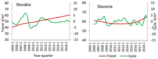 There are some obvious linkages between the timber market and the general economic situation reflected in macroeconomic indicators and business cycles [,]. In the years 2000–2005, the beech roundwood market in Europe was unstable, with price increases attributable to roundwood and sawtimber exports to Asia []. In particular, the study period was characterized by growing exports to China, especially of hardwood []. In the years 2005–2008, the Central European market revealed an upward trend in timber prices with beech roundwood prices peaking at the height of economic prosperity in 2007 and 2008. In Germany, Czechia, and Poland beech roundwood reached the maximum nominal prices in Q1 2008 at 77.54 € m−3, 75.66 € m−3, and 57.75 € m−3, respectively. The 2008–2009 slump in timber prices caused by the American financial crisis destabilized the large-diameter log market [,,,,] with beech roundwood prices entering a period of stagnation in most European countries [,]. Shrinking demand led to a downturn in the beech roundwood market in 2009–2013, especially due to lower activity in the construction and manufacturing industries. On the other hand, over the past decade there was an increasing emphasis on wood as a renewable energy resource [], in accordance with European Union policies in particular European Commission 2009 Directive 2009/28/EC of energy from renewable sources. Also the rising prices of fossil fuels have provided a growth impulse for the prices of beech fuel wood. In turn, the decreasing demand for hardwood furniture undermined the prices of sawmill timber []. The contribution of cyclical fluctuations to the overall beech roundwood price variation was the highest in Poland and Slovakia, amounting to 78.9% and 78.6%, respectively. These two markets were the most sensitive to economic developments, exhibiting the highest price amplitudes within cycles. In contrast, roundwood prices in Slovenia and Germany were the most resilient to economic shocks. According to Gejdos et al. [] the prices of beech sawtimber are likely to increase in the near future, except for Austria. As new technologies enable the use of beech roundwood in wooden constructions, greater demand for this assortment seems to be a matter of time.