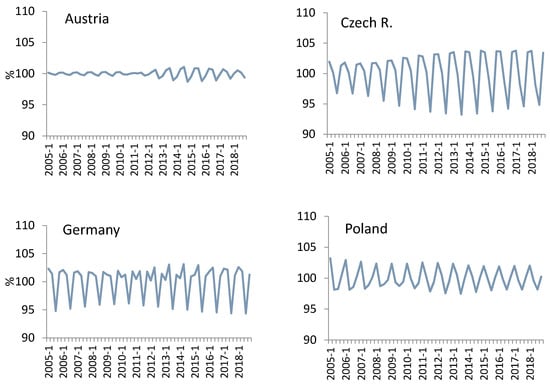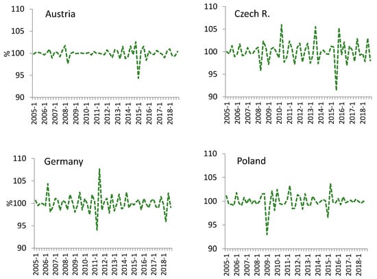 In the analyzed period, the Czech market faced a general oversupply of timber, and especially salvaged spruce roundwood. The overall volume of timber harvested in Czechia increased gradually to 19,387,000 m3, including 502,000 m3 of hardwood in 2017. In recent years, overall timber prices declined by approx. 20% [], in contrast to the prices of large-diameter beech logs, which were higher than those in Slovenia, Slovakia, and Poland, and exhibited an upward trend after 2014. In the study period, seasonal fluctuations revealed an increasing effect on roundwood prices, with 2009 amplitudes reaching approx. 10%. The largest irregular change occurred in Q2–Q3 2015, when market prices dropped in response to the hurricane Niklas, with a similar situation in Austria.