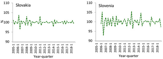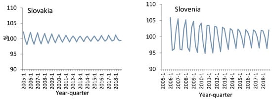 The effects of seasonal, cyclical, and irregular fluctuations on the overall price variation primarily depended on the adopted time span and greatly differed between the selected countries (Table 3). Within a one-quarter span, Czech, German, and Slovenian price series were dominated by seasonal fluctuations, which accounted for 54.1%, 60.2%, and 54.9% of overall variation, respectively. In turn, cyclical variability was dominant in Poland and Slovakia, explaining 53.5% and 47.6% of the overall price variation, respectively. Finally, irregular changes were the predominant component of the Austrian price time series (49.2%). Within a two-quarter span, cyclical price fluctuations dominated in Austria, Germany, Poland, and Slovakia, while seasonal variability was the component in Czechia (51.6%) and Slovenia (67.5%) (Table 3). In terms of annual average values, cyclical fluctuations explained the largest portion of price variation, while irregular changes accounted for the smallest percentage of price variation (from 7.6% in Poland to 23.5% in Austria).