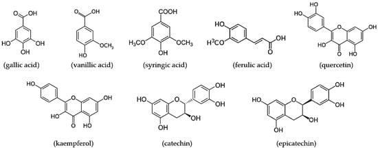 Phenolic compunds (Figure 2) are one of the largest groups of secondary metabolites in the plants with great importance due to their occurrence and the pharmacological properties [11]. These compounds show a large diversity of structures from simple molecules (e.g., phenolic acids) to polyphenols (e.g., stilbenes, flavonoids, and derived polymers) [12]. These compounds protect the plants against some herbivores and affect positively mammals (humans included) due to the antioxidant, antimicrobial, anti-inflammatory and anticarcinogenic activities [13]. Even though, phenolic compounds display a large variety of biological activities, most of them are secondary effects of the antioxidant activity, which has several proposed mechanisms of actions. The general idea is that phenolic compounds may provide an electron to be donated or the whole hydrogen atom, from the O–H bond, to be transferred to free radical molecules, thus transforming the free radicals into harmless species. This process also transforms the phenolic into a radical, with an odd electron, but because of the aromatic structure the odd electron has the possibility to be spread over the entire molecule, resulting in a radical stabilization [14].