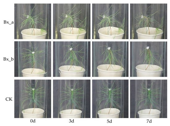Disease phenotype of pine seedlings inoculated with aseptic B. xylophilus (Bx_a), B. xylophilus with S. maltophilia (Bx_b), or S. maltophilia alone (CK), at 0, 3, 5, and 7 days post inoculation (dpi), respectively.