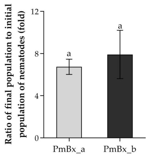 Population of B. xylophilus at 7 days post inoculation (dpi). Aseptic B. xylophilus (PmBx_a), B. xylophilus with S. maltophilia (PmBx_b). The bars indicate S.D., and two samples with a common letter are not significantly different (p > 0.05) according to the Student’s t test.