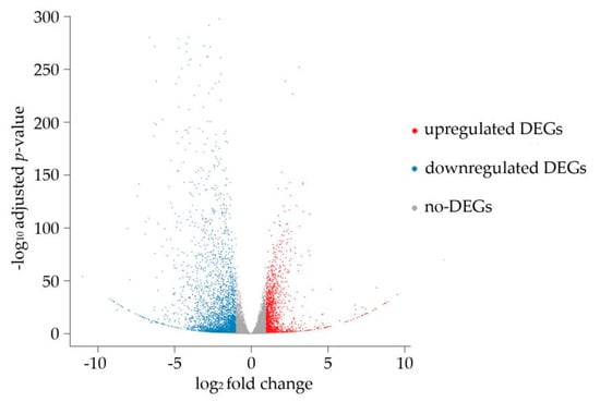 Volcano-Plot of differentially expressed genes (DEGs) of pine wood nematodes in aseptic condition and with S. maltophilia. The number of upregulated DEGs (log2 fold change ≥ 1, adjusted p-value ≤ 0.05) is 1477, the number of downregulated DEGs (log2 fold change ≤ −1, adjusted p-value ≤ 0.05) is 2763, the number of no-DEGs (absolute value of log2 fold change < 1 or adjusted p-value > 0.05) is 11,942.