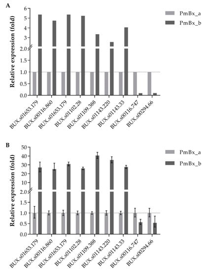 Relative expression of differentially expressed genes of B. xylophilus in aseptic condition (PmBx_a) or with S. maltophilia (PmBx_b). Relative expression of differentially expressed genes by sequencing (A) and the real-time quantitative polymerase chain reaction (qPCR) (B), the bars indicate S.D.