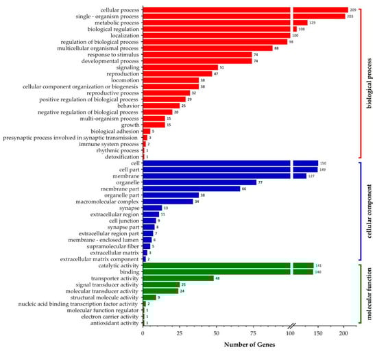 All the transcripts were further functionally characterized into three GO categories: biological process, cellular component, and molecular function. Among the set of 4240 DEGs, 356 genes were associated with at least one GO term, and a total of 50 different GO terms were found. Twenty-four GO terms were involved in biological processes, 16 GO terms were associated with cellular components, and 10 GO terms had various molecular functions (Figure 5). Among the biological process terms, the cellular process, single-organism process, and metabolic process terms were the three terms containing the greatest number of DEGs. In the cellular component category, the top three GO terms were cell, cell part, and membrane, and for the molecular function category, catalytic activity, binding, and transporter activity were the top three terms (Figure 5).