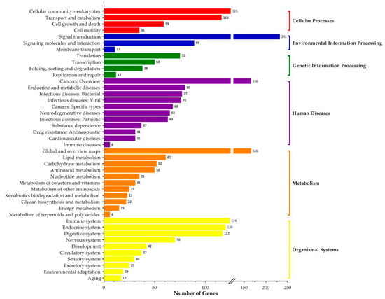The putative functions of DEGs were also analyzed with KEGG classification. The 871 DEGs could be mapped to 301 different pathways that might be affected by S. maltophilia. KEGG Orthology (KO) analysis showed that most DEGs were assigned to human diseases, metabolism, and organismal systems. In the human diseases class, “cancers: overview”, “endocrine and metabolic diseases”, and “infectious diseases: bacterial” had many DEGs. “Global and overview maps”, “lipid metabolism”, “carbohydrate metabolism”, and “amino acid metabolism” were the dominant terms in the metabolism class. Few transcripts were assigned to “xenobiotic biodegradation and metabolism” (23 transcripts) and “metabolism of terpenoids and polyketides” (6 transcripts) (Figure 6). This result showed that S. maltophilia mainly affected the growth and development of nematodes. In the organismal systems category, “immune system”, “endocrine system”, and “digestive system” had more transcripts. The top five enriched groups among the KEGG categories included signal transduction, cancers: overview, global and overview maps, cellular community-eukaryotes, and immune system.