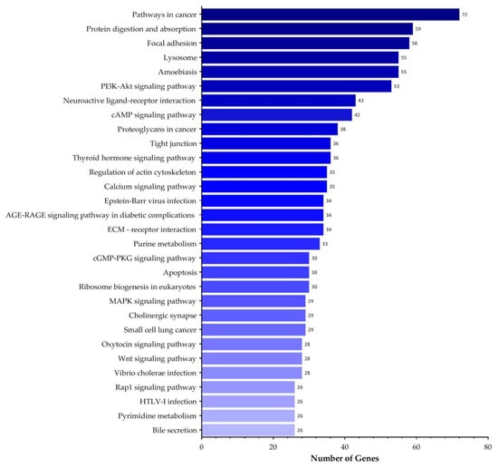 A list of the top 30 pathways and number of transcripts mapped to those pathways are shown in Figure 7. The most highly active pathway was cancer (ko05200), with 72 active transcripts, followed by protein digestion and absorption (ko04974, 59 transcripts). A number of signaling pathways that are known to be involved in development and diverse functions were active in PmBx_a, such as the wnt signaling pathway (ko04310), rap1 signaling pathway (ko04015), PI3K-Akt signaling pathway (ko04151), cAMP signaling pathway (ko04024), cGMP-PKG signaling pathway (ko04022), ECM-receptor interaction, MAPK signaling pathway (ko04010), and calcium signaling pathway (ko04020). Thus, it can be concluded that S. maltophilia affects the immune system of B. xylophilus.