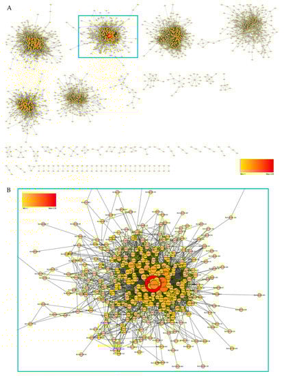 Interactions of proteins encoded by differentially expressed genes of B. xylophilus between aseptic condition and with S. maltophilia. Protein interactions of all differentially expressed genes (A); enlarged view of protein interactions (B). The larger the circle and the redder the color, the more proteins interacted with the protein, and the smaller and yellow the fewer interactions.