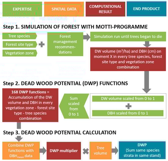 Calculation of dead wood potential (DWP) was executed in three steps. First, simulations of forest growth produced the needed information of forest growth in 168 combinations of seven tree species, six forest site types, and four vegetation zones. Second, based on the previous information, altogether 168 different DWP functions were developed. Third, the spatial data of forest stands was converted into the DWP for each tree species with DWP functions. DW = dead wood, DBH = diameter at breast height, DBHmean = mean diameter at breast height.