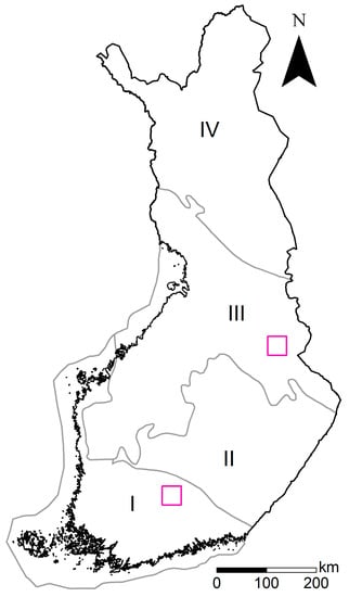The map of Finland, the vegetation zones used in DWP modeling, and locations of the validation sites. The vegetation zones (grey lines) are as follows: I Southern Finland (vegetation zones 1 (hemiboreal), and 2a and 2c (southern boreal)), II Middle Finland (2b (southern boreal)), III Ostrobothnia and Kainuu (3a–c (middle boreal)), and IV Northern Finland (4a–d (northern boreal)). Southern (Evo) and northeastern (Kuhmo) sites are marked with pink squares.