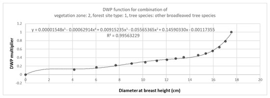where the DWP multiplier stands for the DWP function value at DBHmean of 10 cm (here 0.3). This is multiplied with the volume (i.e., 30 m3/ha) to achieve the DWP value 0.3 × 30 = 9.