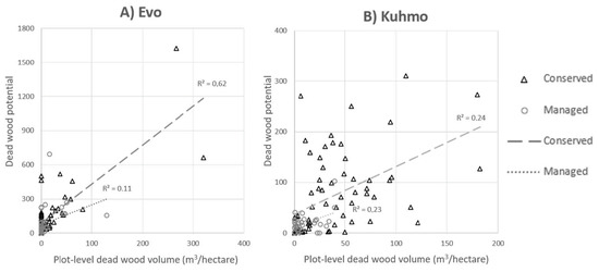 Correlation between the dead wood potential (DWP) and dead wood volume in Evo and Kuhmo. The x-axis describes the plot level dead wood volume (m3 per hectare) and y-axis the DWP value for each plot. Both values are sums of different tree species in each plot. Plots on managed and conserved areas are marked with black triangles and gray circles, respectively. Coefficients of determinations are shown with dashed lines for managed and with dotted line for conserved field plots.