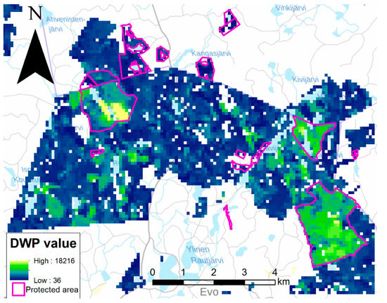 Map of Evo validation area where tree stand data has been converted to dead wood potential (DWP) of each 96 × 96 m pixel. Protected forest areas are marked with pink borders. Only areas managed by Metsähallitus are included in this calculation.