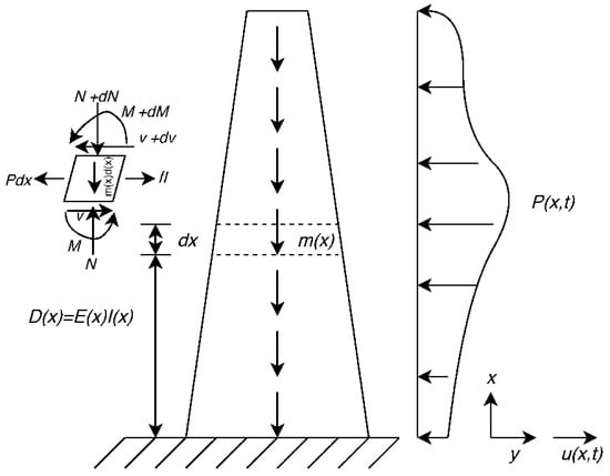 where y is the lateral direction, x is the elevation from the base, u(x,t) is the motion of the column in y direction, m(x) is mass per unit length and P(x,t) is the external transverse force.