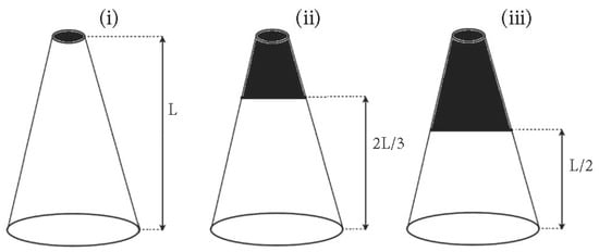 The effect of crown mass on the natural frequency was investigated by creating an equivalent “crown” using an additional mass (Wc) at different locations along the stem (see Figure 3). (i) In the first case, the additional crown mass was applied to the top of the stem, (ii) in the second, the same crown-to-stem mass ratios were applied to the upper two-thirds (by volume) of the stem and (iii) in the third case, they were applied to the upper half (by volume) of the stem. In all cases, we define different crown-to-stem mass ratios (Wc/Ws) at these particular locations.