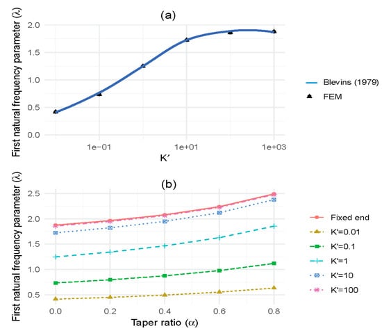 (a) Comparison of theoretical and numerical first natural frequency parameter ratio with relative rotational base stiffness, and (b) taper ratio versus first natural frequency parameter ratio with varying rotational base stiffness.