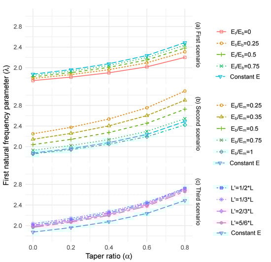 (a) Taper ratio versus first natural frequency parameter ratio with longitudinal stiffness variation linearly from the bottom to the top end of the tree (first scenario), (b) taper ratio versus first natural frequency parameter ratio with longitudinal stiffness variation linearly from the bottom to one-third of the tree height, followed by a linear variation till the top end of the tree (second scenario) and (c) taper ratio versus first natural frequency parameter ratio with longitudinal stiffness variation linearly from the bottom to L’, followed by a linear variation till the top end of the tree (third scenario).