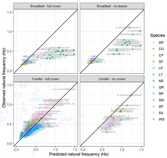 Comparison between predicted natural frequency and observed natural frequency for selected trees from the published literature. The grey points show the range of simulated values and the coloured symbols represent the mean result for each tree. The solid black line indicates a 1:1 relationship.