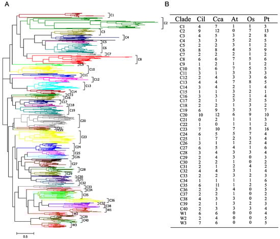 Phylogenetic analysis of R2R3-MYBs in five different plant species. (A) Phylogenetic tree of the R2R3-MYB proteins from pecan, Chinese hickory, Arabidopsis, rice and poplar. A total of 770 full-length R2R3-MYB proteins were retrieved from five plant species including Carya illinoinensis (Cil), Carya cathayensis (Cca), Arabidopsis thaliana (At), Oryza sativa (Os), and Populus trichocarpa (Pt). R2R3-MYB proteins from five species were divided into 43 clades (C1 to C40 and W1 to W3). (B) The number of R2R3-MYB proteins in each clade in different species. Detailed information of this phylogenetic tree is provided in Figure S1.