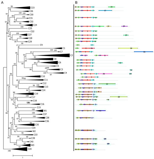 To investigate the structural features of R2R3-MYB genes in pecan, the exon/intron organization of these genes was analyzed. Exon numbers of pecan R2R3-MYB genes ranged from 1 to 13, and only ten were intron-less genes (Figure S2 and Table S3). Most R2R3-MYB genes possessed less than six exons, except CIL1535S0029 and CIL1277S0025, which contained 13 and 12 exons, respectively. The majority of pecan R2R3-MYB genes (103/153) contained three exons, 28 contained two exons, 7 contained four exons, and three contained five exons. In general, exon 1 and 2 encoded almost the entire R2 and R3 MYB repeats among the R2R3-MYB genes that contained three exons. Genes in the same clades commonly shared similar exon/intron patterns in pecan, and a similar phenomenon was also found in Arabidopsis and rice []; for example, all eight genes in C6 contained only one exon, and six genes in W1 had three exons (Figure S2).