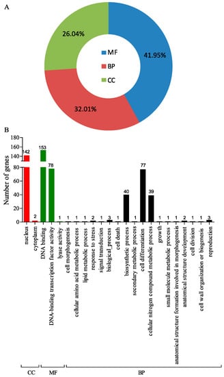 Molecular function (MF), biological process (BP), and cellular component (CC) are three main GO categories, and are characteristics of genes that help to illuminate various functions of proteins []. GO annotations of 153 pecan R2R3-MYBs were further investigated using Blast2GO software. We found that the R2R3-MYBs were involved in all three GO categories; the largest portion (41.95%) of GO terms were involved in the MF category (Figure 4A), 32.01% were involved in the BP category and 26.04% were involved in the CC category. According to the MF results, all 153 genes were involved in DNA binding (GO:0003677), and 78 genes were related to DNA-binding transcription factor activity (GO:0003700), indicating the R2R3-MYBs bind to DNA to regulate the target genes (Figure 4B). Interestingly, 142 genes participated in the nucleus in CC (GO:0005634), suggesting that the majority are localized in the nucleus, which was consistent with the subcellular localization prediction results (Table S3). Moreover, 18 GO terms were found in the BP category, and the top three GO terms included cell differentiation (77 genes), biosynthetic process (40 genes), and cellular nitrogen compound metabolic process (39 genes), suggesting these pecan R2R3-MYBs are associated with various biological processes (Figure 4B).