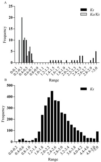 Synonymous substitutions (Ks), such as a time indicator, were used to estimate the date of duplication events. The distribution of Ks values of duplication events in the pecan R2R3-MYB gene family revealed that the Ks varied from 0.33 to 4.81 and peaked in a range from 0.3 to 0.5 (Figure 5A and Table S5). Surprisingly, the frequency of Ks values could be obviously divided into two parts, and the percentage of the frequency of Ks that ranged from 0.3 to 0.7 was 55.77%. However, the remaining 44.23% of the frequency of Ks varied from 1.3 to 4.81, revealing that recent duplications functioned in the expansion of the R2R3-MYB gene family in pecan (Table S5). The distributions of Ks in this gene family were further investigated, and the Ks values peaked at 2.2 to 2.4 (Figure 5B).