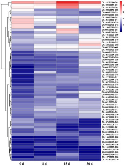 In total, 7305 differentially expressed genes (DEGs) with fold change ≥ 2 and false discovery rate (FDR) < 0.01 were identified according to the RNA-seq data; 4330 genes were significantly up-regulated (Figure S5A), and 2975 genes were significantly down-regulated during the graft union formation in pecan (Figure S5B). Among the DEGs, 64 genes were further identified as R2R3-MYB gene family members, with 47 genes up-regulated and 17 down-regulated (Figure 6). The 64 R2R3-MYB genes displayed different expression patterns, indicating that they participated in various biological processes. For example, five R2R3-MYB genes in C6 (CIL1107S0014, CIL1023S0011, CIL1207S0053, CIL0925S0130, and CIL1463S0018) all showed high expression levels at 15 d after grafting, suggesting they might be involved in callus formation and cambium establishment.